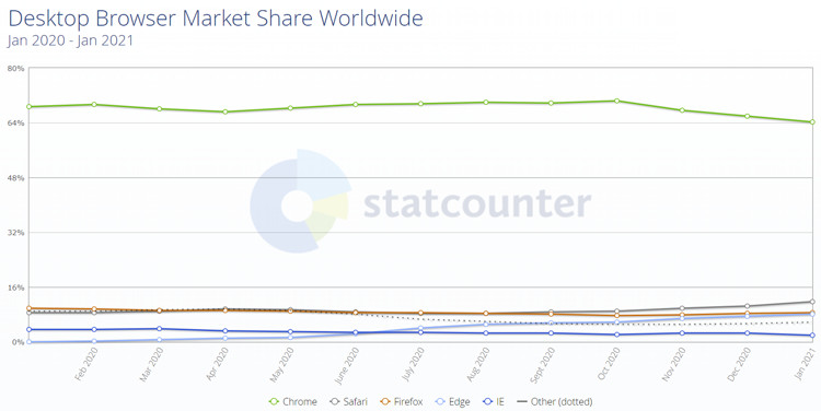 Почему мы остановились именно на Google Chrome? Потому, что это самый популярный браузер в мире. Показатели StatCounter, ирландского сайта-инструмента для анализа web-трафика, количество пользователей Chrome достигло 3,3 миллиардов, а его рыночная доля — 63,63% (данные на январь 2021 года).