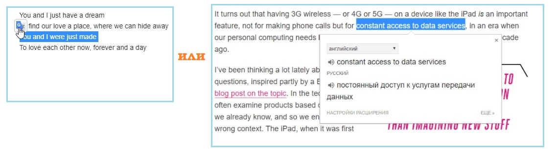 кликнуть мышью по иконке Google Translate. Часто достаточно просто выделить нужный текст.