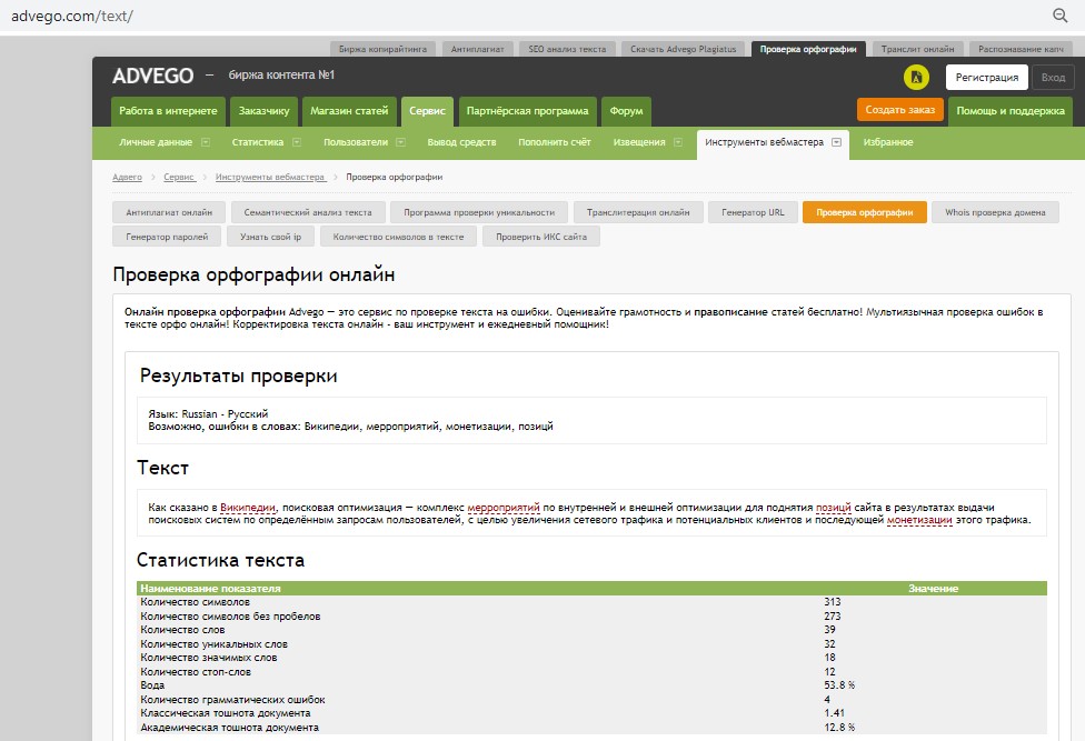 Сайт Advego Плагиатус — является эффективной программой для поиска копий текстовых документов — полных или частичных, определения степени уникальности текста, а также позволяет проверять орфографию.