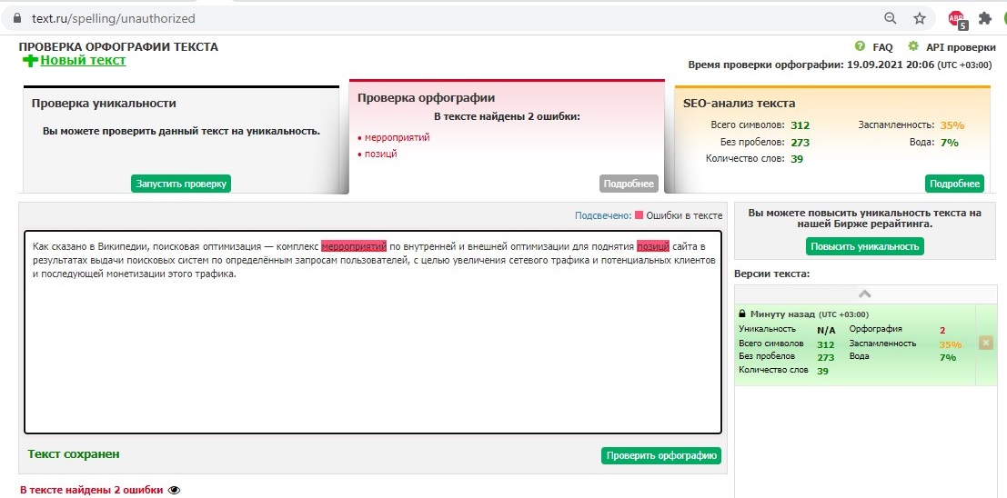Сайт отличается простотой и комфортом использования: вставляете текст в специальное поле и активируете функцию проверки. В результате получаете такие показатели, как: