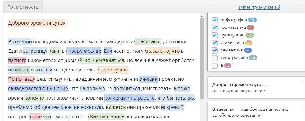 Инструмент помогает быстро увидеть ошибки, выделяя их в тексте ярким цветом.