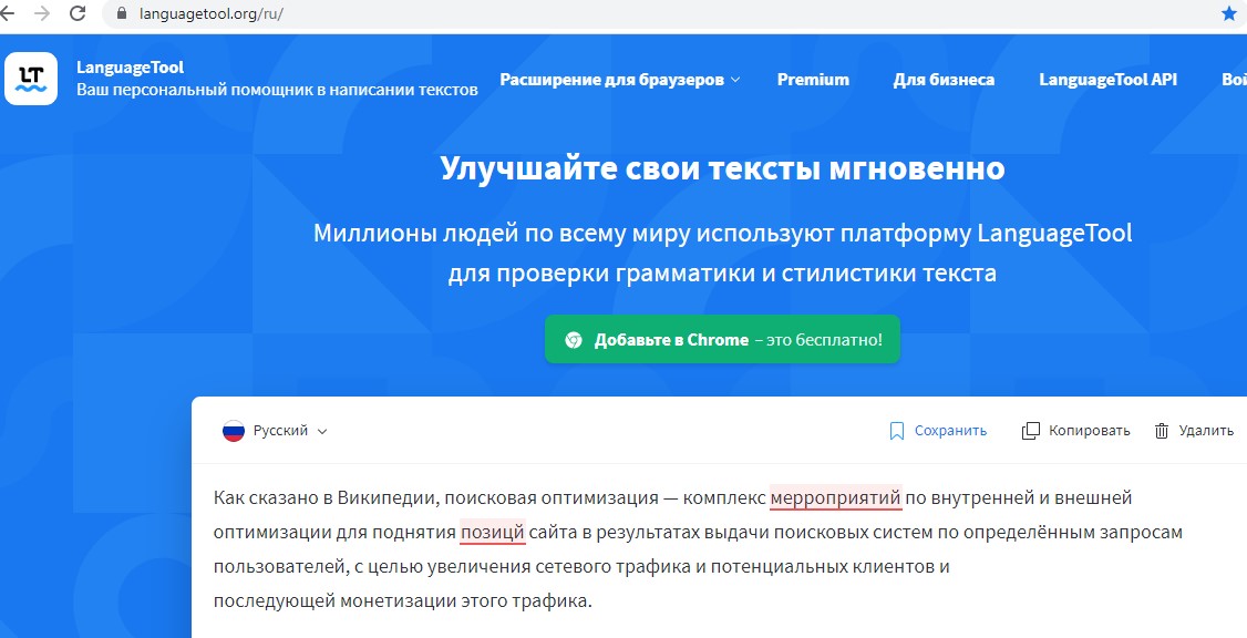 Ресурс позволяет либо воспользоваться онлайн редактурой текста, либо инсталлировать расширение непосредственно в браузер для максимально комфортной работы.
